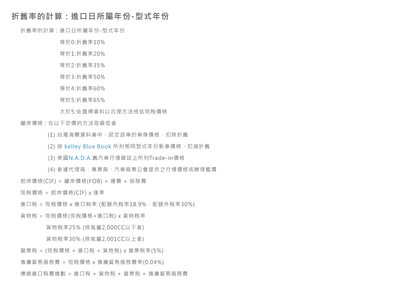 • 離岸價格 FOB = 車身價格 x (1 - 折舊率) = USD$• 離岸價格 FOB = 車身價格 + 運費 = USD$ |